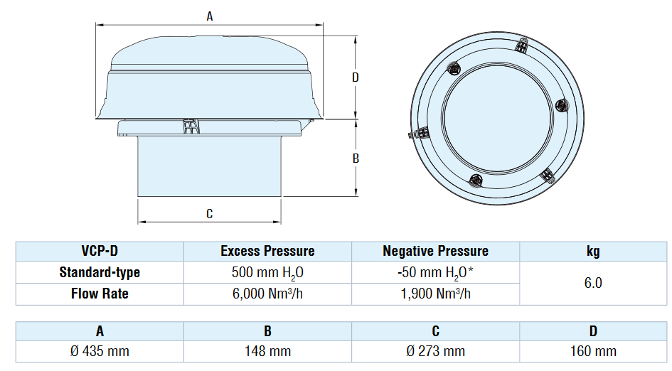 VCP-D přetlakový a podtlakový ventil se skládá z polymerového těla a ocelové navařovací příruby, vnitřní kruhový disk z polymeru pro podtlak upevněný pomocí středové tyče s pružinou, vnější prstenec z polymeru s třemi tyčemi a pružinami + těsnění pro přetlak, kryt z polymeru chránicí proti povětrnostním vlivům. Spojení příruby a ventilu se provádí pomocí šroubů